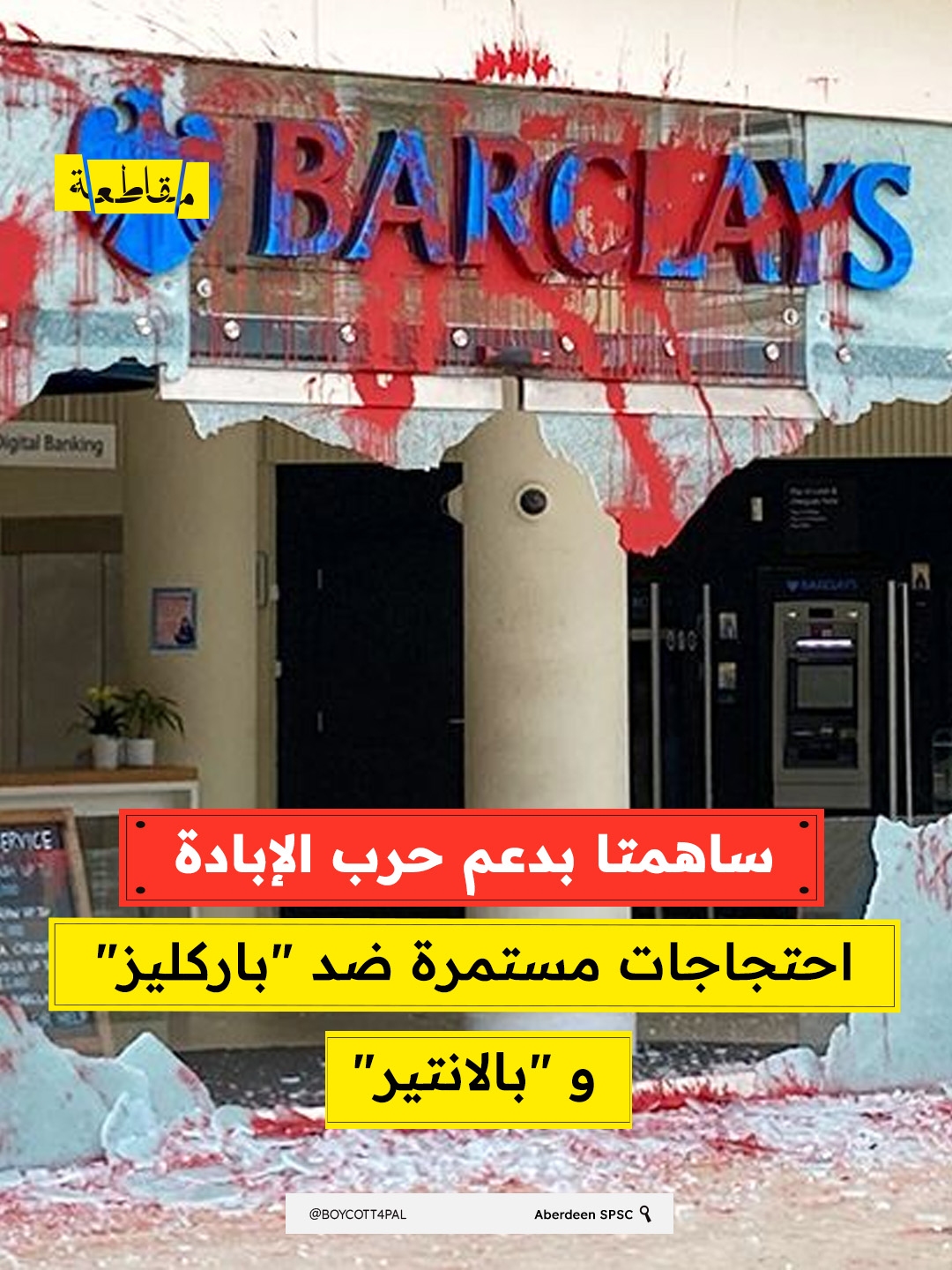 نفذ أنصار فلسطين احتجاجًا داخل أحد فروع بنك "باركليز" في أبردين للمطالبة بوقف استثمارات البنك في شركات إسرائيلية منها "إلبيت سيستيمز" كما عبّر المحتجون عن رفضهم لتواطؤ شركة "بالانتير تكنولوجيز" بسبب تقديمها تقنيات تُستخدم لدعم الاحتلال الإسرائيلي وعدوانه بحق الشعب الفلسطيني واللبناني والإيراني.