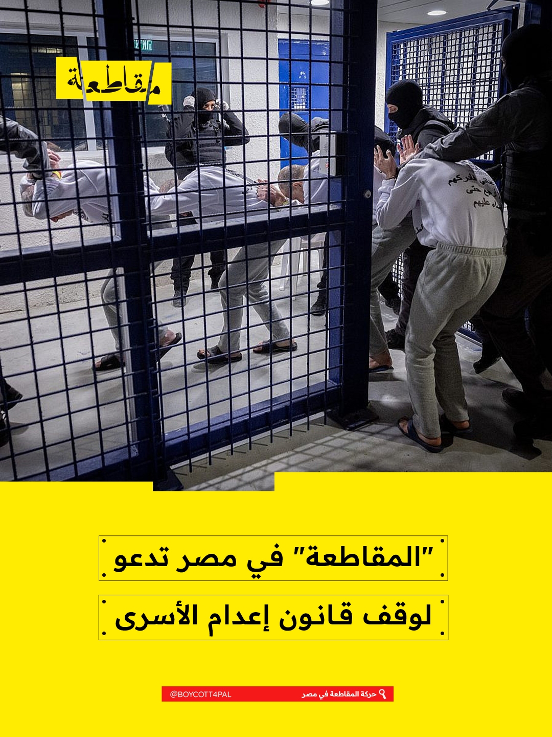 دعت حركة المقاطعة في مصر إلى وقف قانون إعدام الأسرى فورًا، والإفراج الكامل عن كل المعتقلين وفتح تحقيق في جرائم التعذيب بحق الأسرى، كما طالبت “الحركة” في بيانها إلى الضفط الدولي على الاحتلال للسما