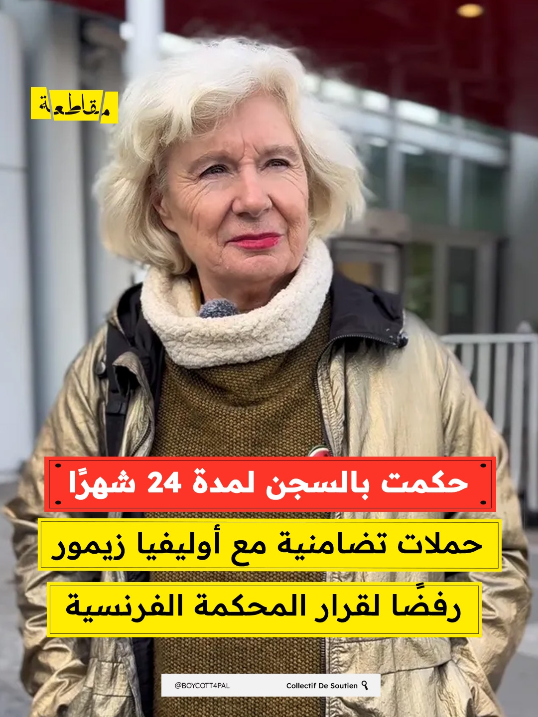 ندد تجمع Collectif de soutien au peuple Palestinien بالحكم الصادر عن محكمة في باريس بحق الناشطة الفرنسية المؤيدة لفلسطين أوليفيا زيمور، معتبرًا أنه يأتي في إطار “قمع الأصوات الداعمة للشعب الفلسطيني”.