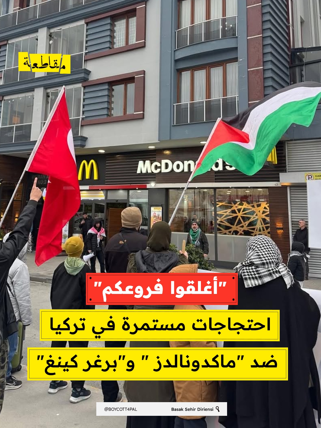 كما يواصل المتضامنون في منطقة باشاك شهير اعتصامهم منذ 156 يومًا أمام أحد فروع “برغر كينغ”، مطالبين بمقاطعة الشركة وإغلاق فرعها في المنطقة بسبب سياسات دعم مماثلة لتلك التي اتبعتها “ماكدونالدز” تجاه جيش الاحتلال الإسرائيلي