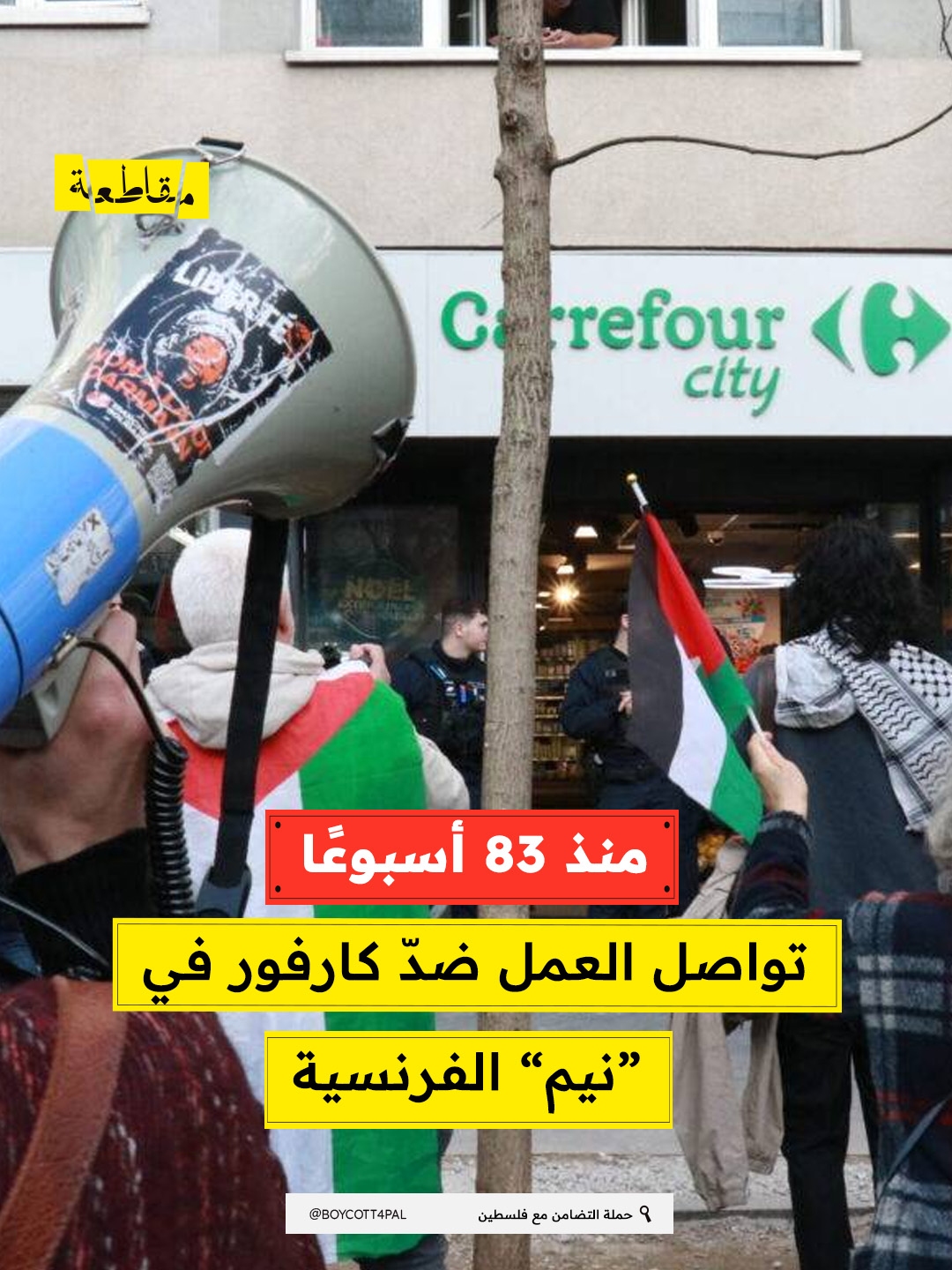 أعلنت حملة التضامن مع فلسطين في نيم، عن تواصل الاحتجاج والعمل ضدّ فرع كارفور بمدنية “نيم” جنوب فرنسا، للأسبو الـ83 تنديدًا ورفضًا لدعم الشركة وتواطؤها مع جيش الاحتلال الإسرائيلي.