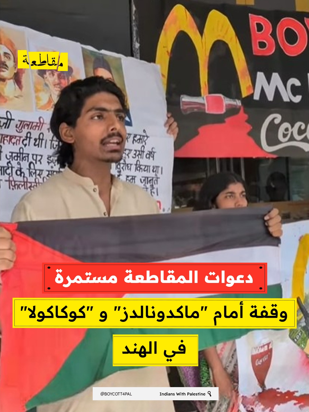 نظّم عدد من أنصار وحركة المقاطعة وقفة احتجاجية أمام فرع "ماكدونالدز" في دلهي، الهند، دعو خلالها لمقاطعة "كوكاكولا" و"ماكدونالدز" على خلفية تواطؤهما في نظام الفصل العنصري الإسرائيلي.