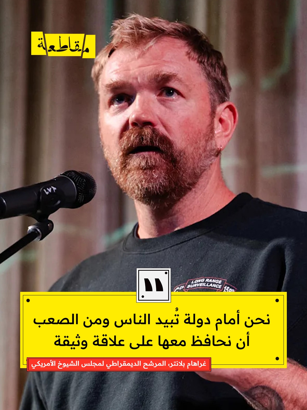 أكد المرشح الديمقراطي لمجلس الشيوخ الأمريكي، غراهام بلانتر، أنه يرفض إنفاق أي دولار من أموال دافعي الضرائب الأمريكيين على تسليح أو حماية دولة ترتكب إبادة جماعية.