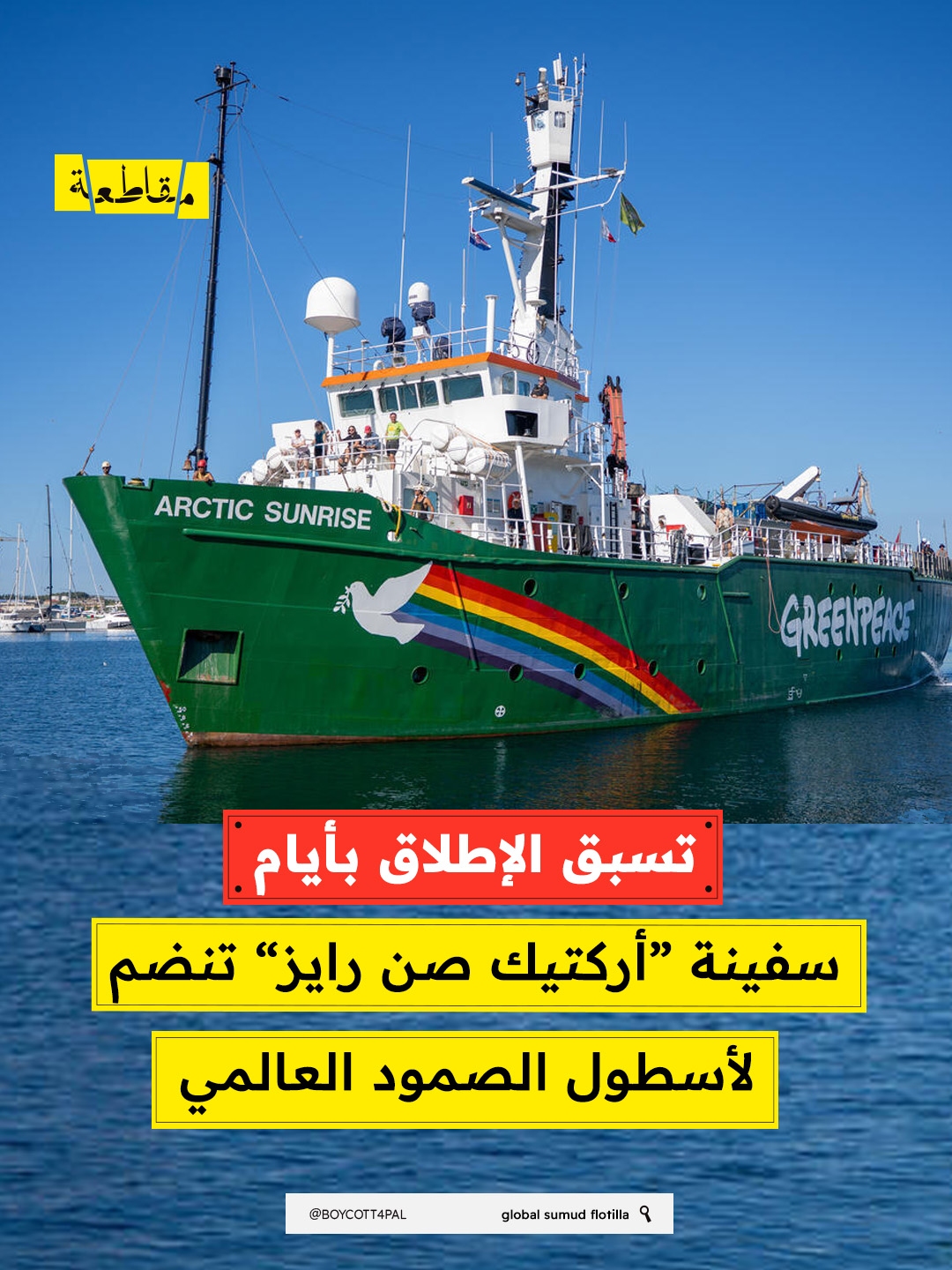 أعلن أسطول الصمود العالمي أن منظمة غرينبيس الدولية ذكرت أن السفينة أركتيك صن رايز ستشارك في رحلة أسطول الصمود العالمي المقرر انطلاقه يوم 12 أبريل، والذي يأتي في محاولة لكسر الحصار المفروض على قطاع غزة.
