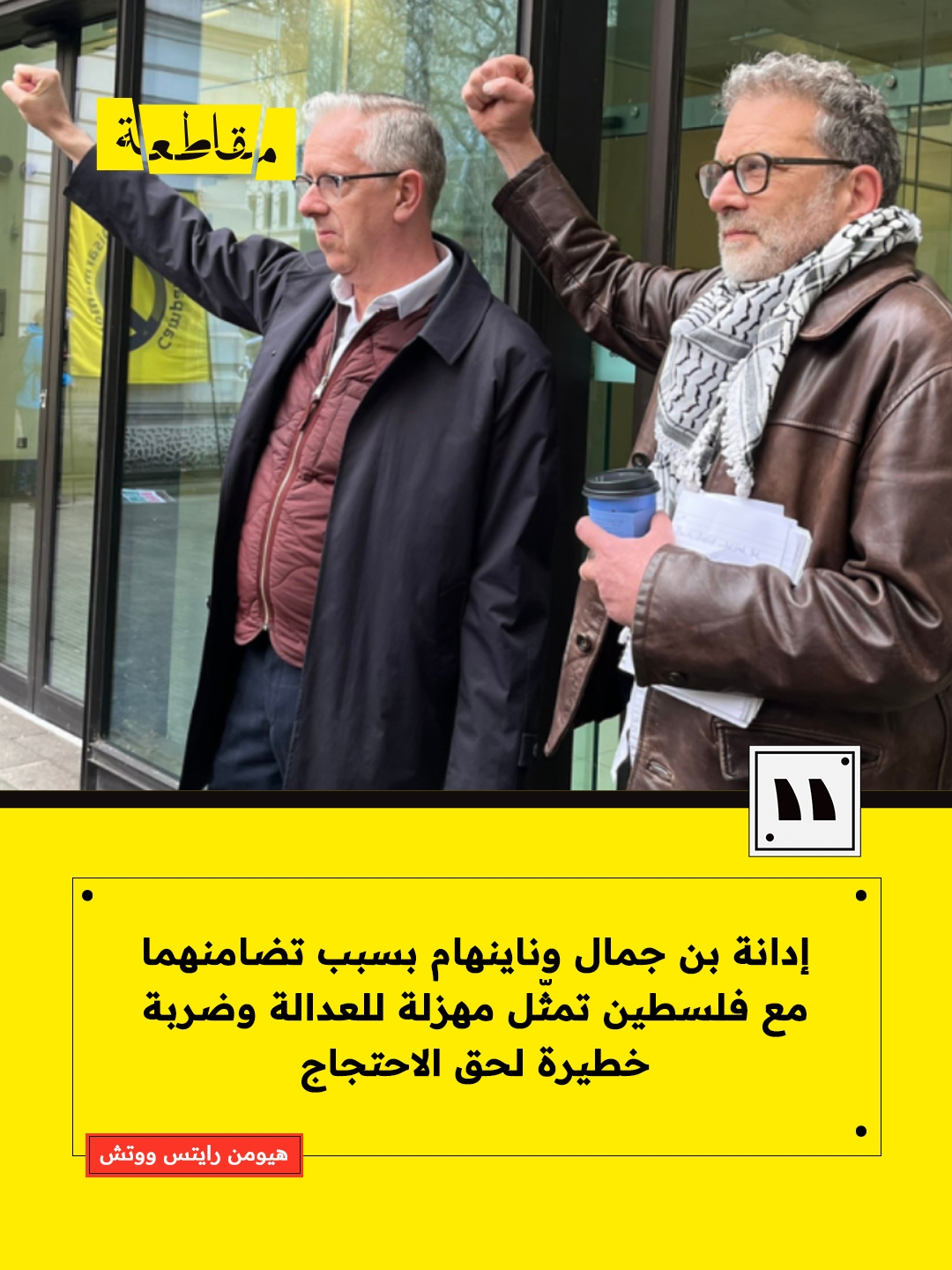 أدانت هيومن رايتس ووتش إدانة الناشطين بن جمال وكريس ناينهام، معتبرةً أن الحكم الصادر بحقهما يشكّل “مهزلة للعدالة” وضربة خطيرة لحق التظاهر ولعمل منظمات المجتمع المدني في المملكة المتحدة.