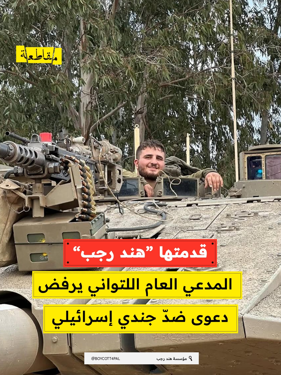أعلنت مؤسسة هند رجب، أن مكتب المدعي العام الليتواني رفض قرارًا ببدء التحقيق التمهيدي مع الجندي الإسرائيلي شون غور، بناءً على شكوى قدمتها المؤسسة، مؤكدةً أنها ستستأنف القرار عبر كل السبل القانونية المتاحة.