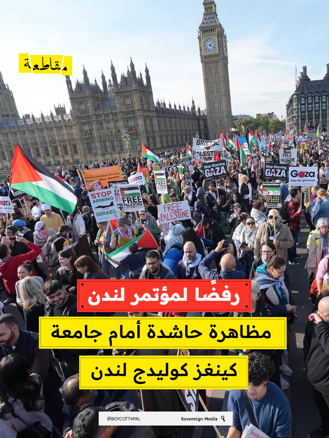 تظاهر مئات الطلبة أمام جامعة كينغز كوليدج في لندن، احتجاجًا على استضافة الجامعة لـ "مؤتمر لندن للدفاع"، الذي يُعد أحد أبرز التجمعات السنوية لشخصيات مرتبطةٍ بصناعات السلاح والدفاع.