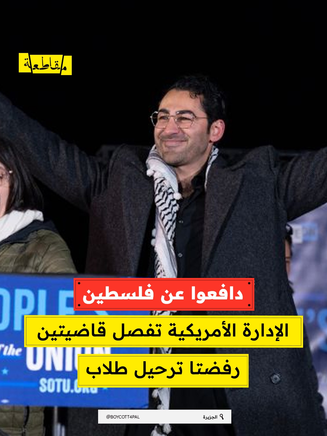 أفادت تقارير قضائية بفصل وزارة العدل الأمريكية لقاضيتي الهجرة روبال باتيل ونينا فرويس يوم الجمعة الماضي، عقب رفضهما إصدار أوامر ترحيل بحق طلاب من بينهم رميساء أوزتورك ومحسن مهداوي، بسبب أنشطتهم الداعمة لفلسطين.
