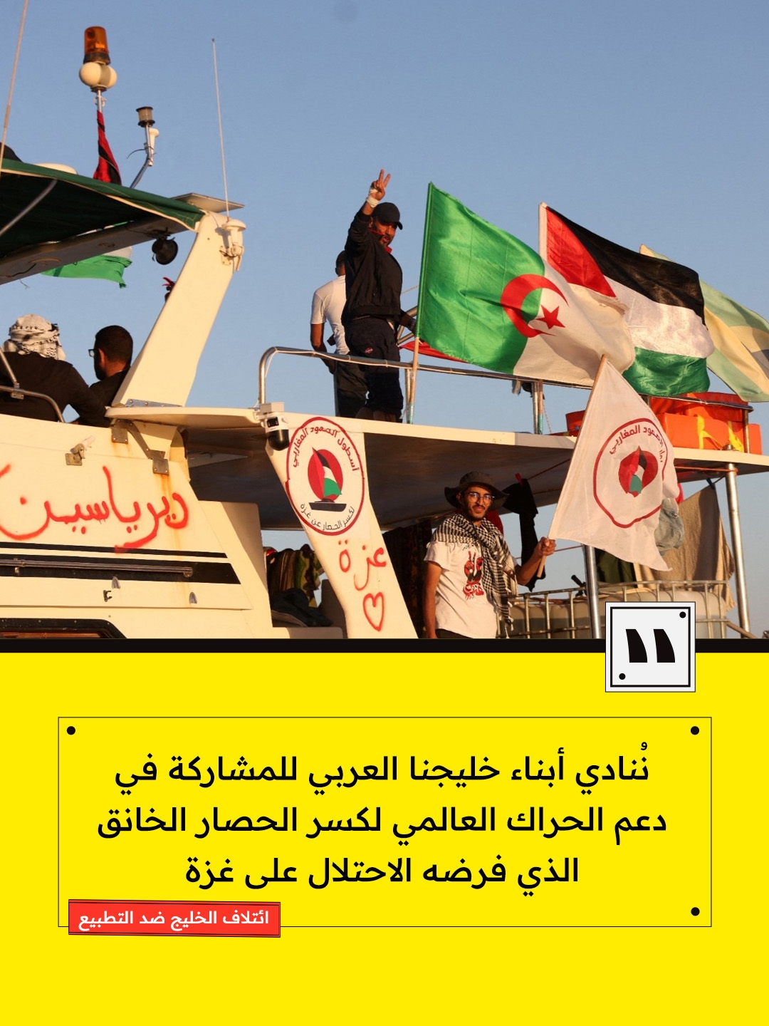 دعا ائتلاف الخليج ضد التطبيع، الخليجيين لمساندة أسطول الصمود العالمي ودعمه في رحلته إلى غزة، من خلال وضع كل الإمكانات في خدمة أي تحرك جاد يعمل على كسر الحصار ووقف العدوان.