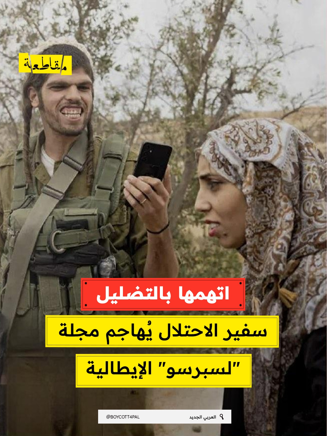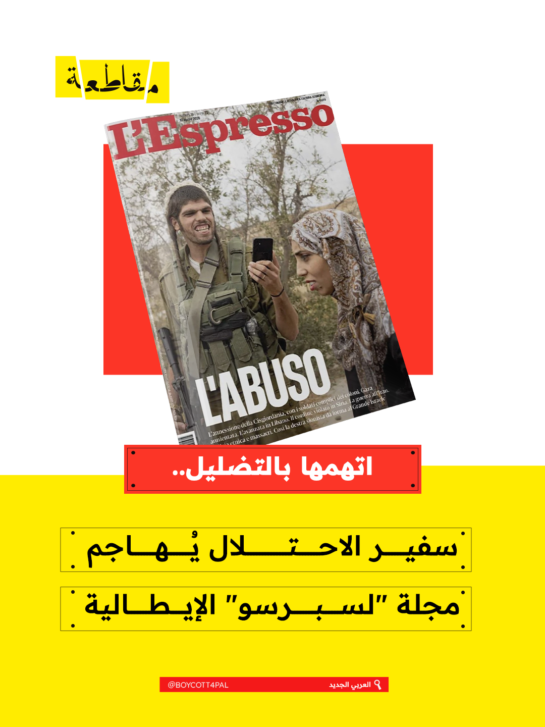 هاجم سفير الاحتلال في إيطاليا، جوناثان بيلد، هجومًا تحريضيًا على مجلة "لسبرسو" عقب نشرها غلافًا لعدد 10 أبريل يوثّق عدوانية المستوطنين.