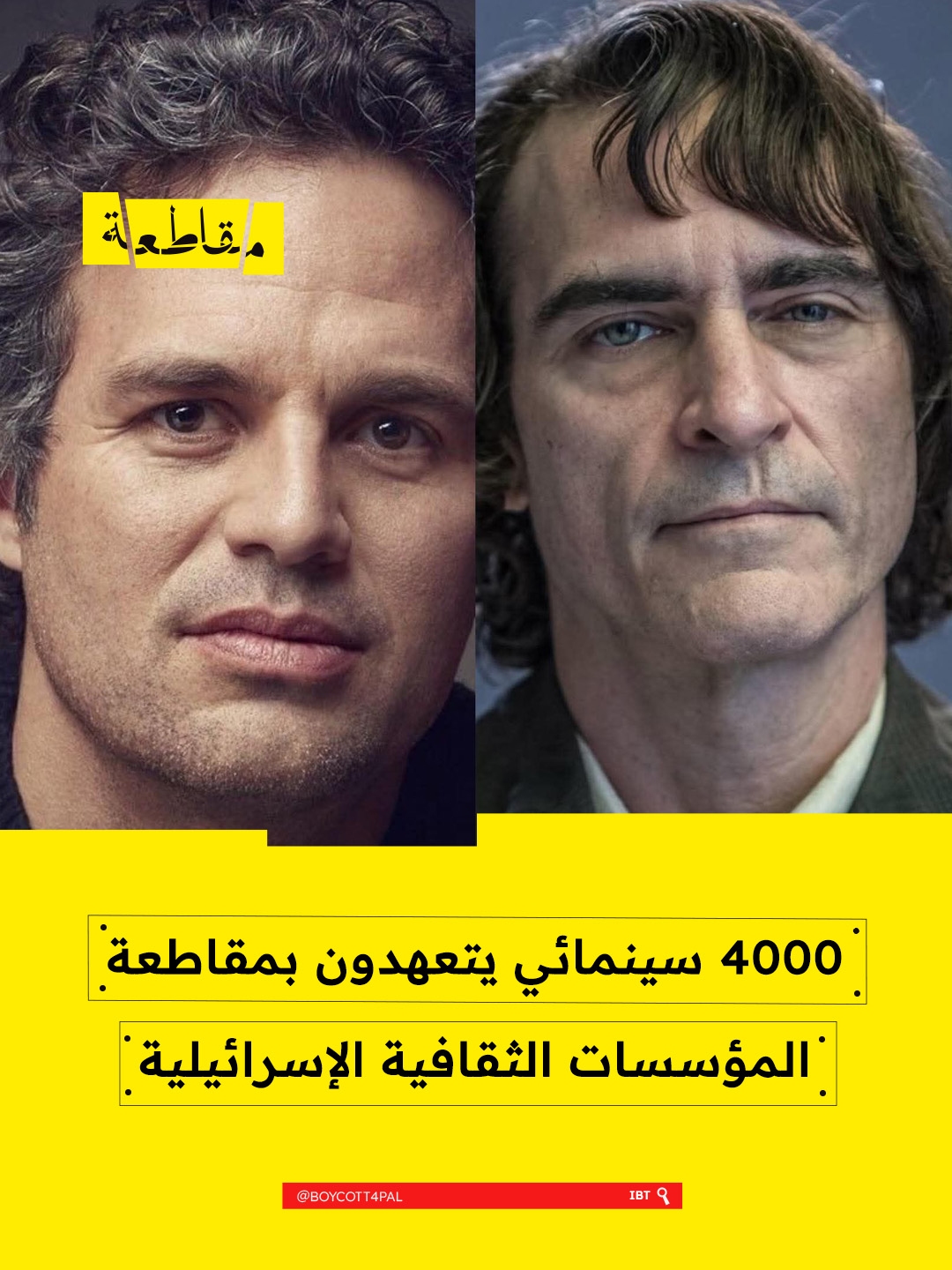 وقع أكثر من 4000 فنان وعامل في قطاع السينما، من بينهم النجمان مارك روفالو وخواكين فينيكس، على تعهد "سينمائيون من أجل فلسطين" بمقاطعة المؤسسات الثقافية الإسرائيلية المتواطئة في نظام الفصل العنصري (الأبارتهايد).