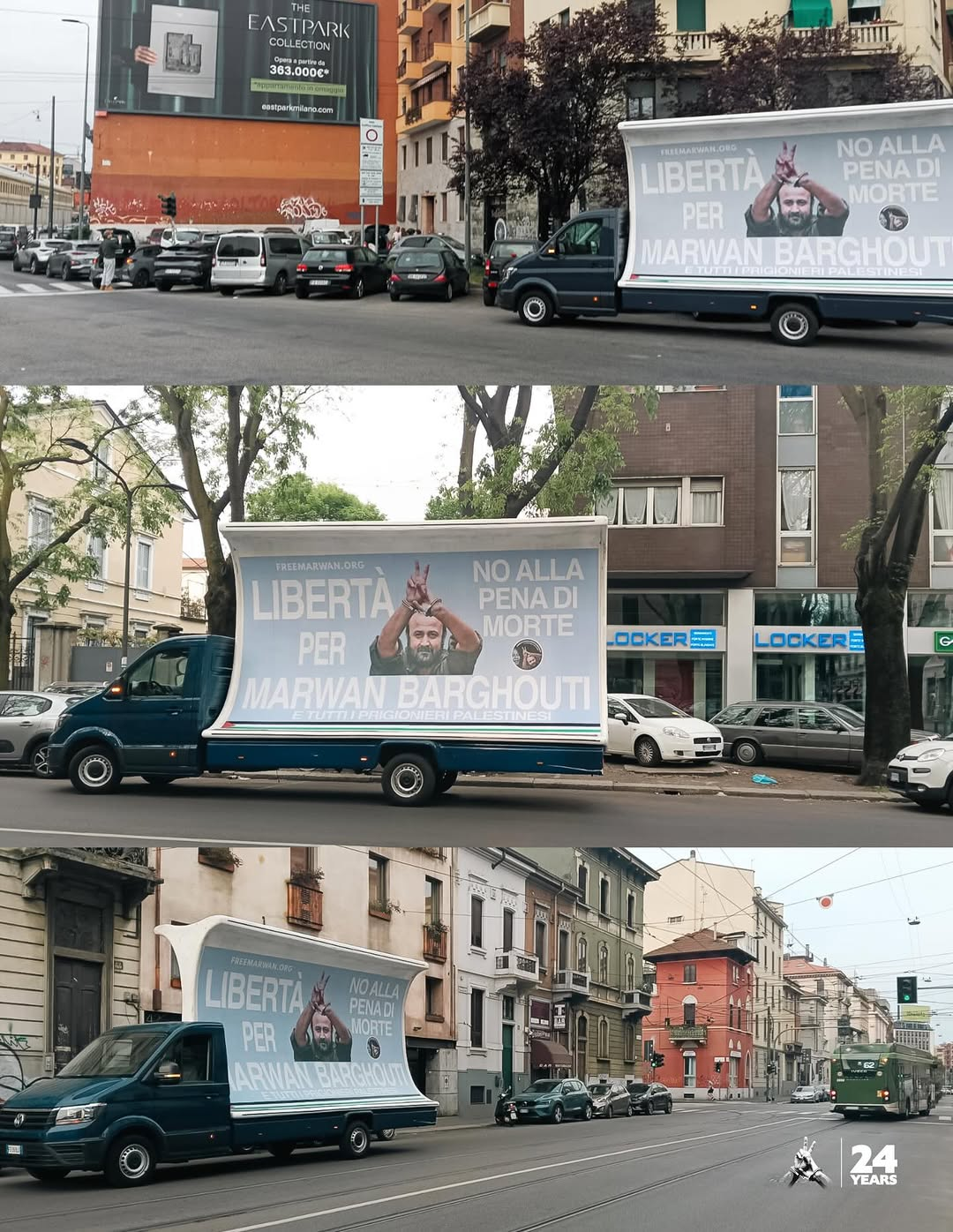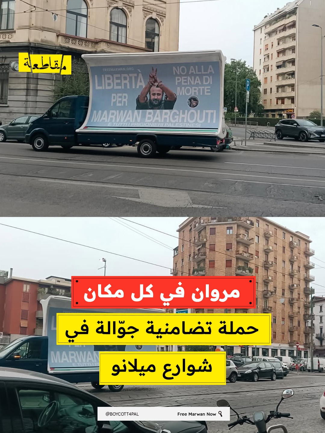 وثّقت مجموعة “حرروا مروان الآن” إطلاق حملة ميدانية لافتة في مدينة ميلانو، تمثلت في شاحنة دعائية تجوب شوارع المدينة وعلى متنها لوحات تطالب بالإفراج عن الأسير الفلسطيني مروان البرغوثي وكافة الأسرى السياسيين.
