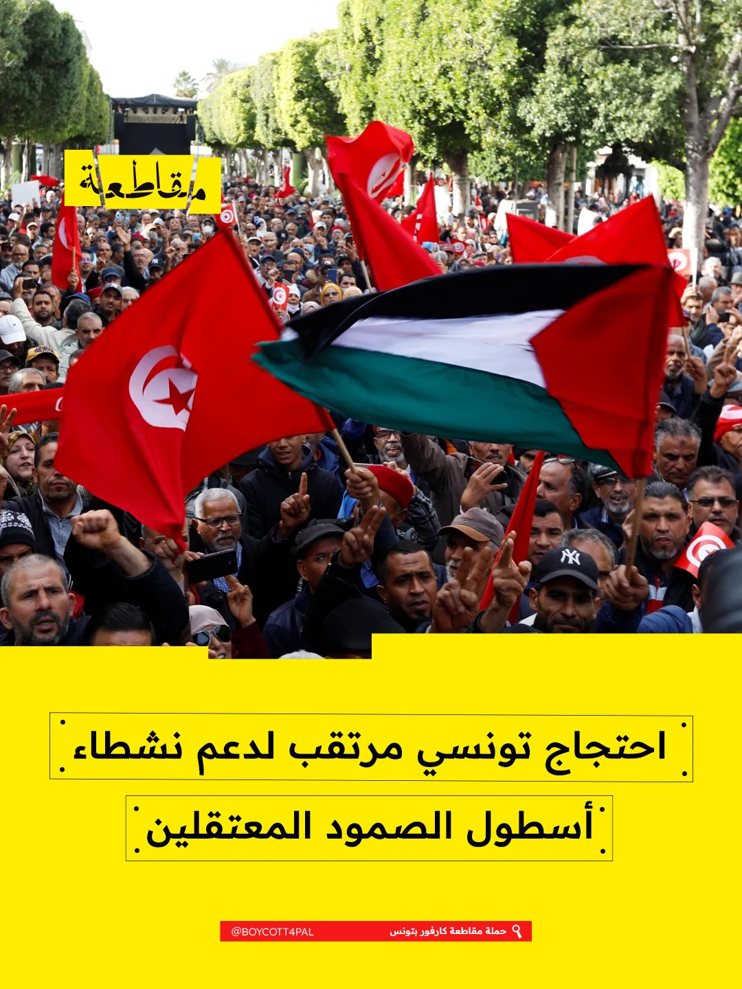 دعا كلّ من أسطول الصمود المغاربي وحملة مقاطعة كارفور في تونس إلى وقفة إسناد تضامنية مع الناشطين الداعمين للقضية الفلسطينية، وذلك على خلفية جلسة الاستنطاق المرتقبة لعدد من المناصرين، من بينهم وائل نوار وسناء المساهلي، على خلفية مواقفهم الداعمة لفلسطين.