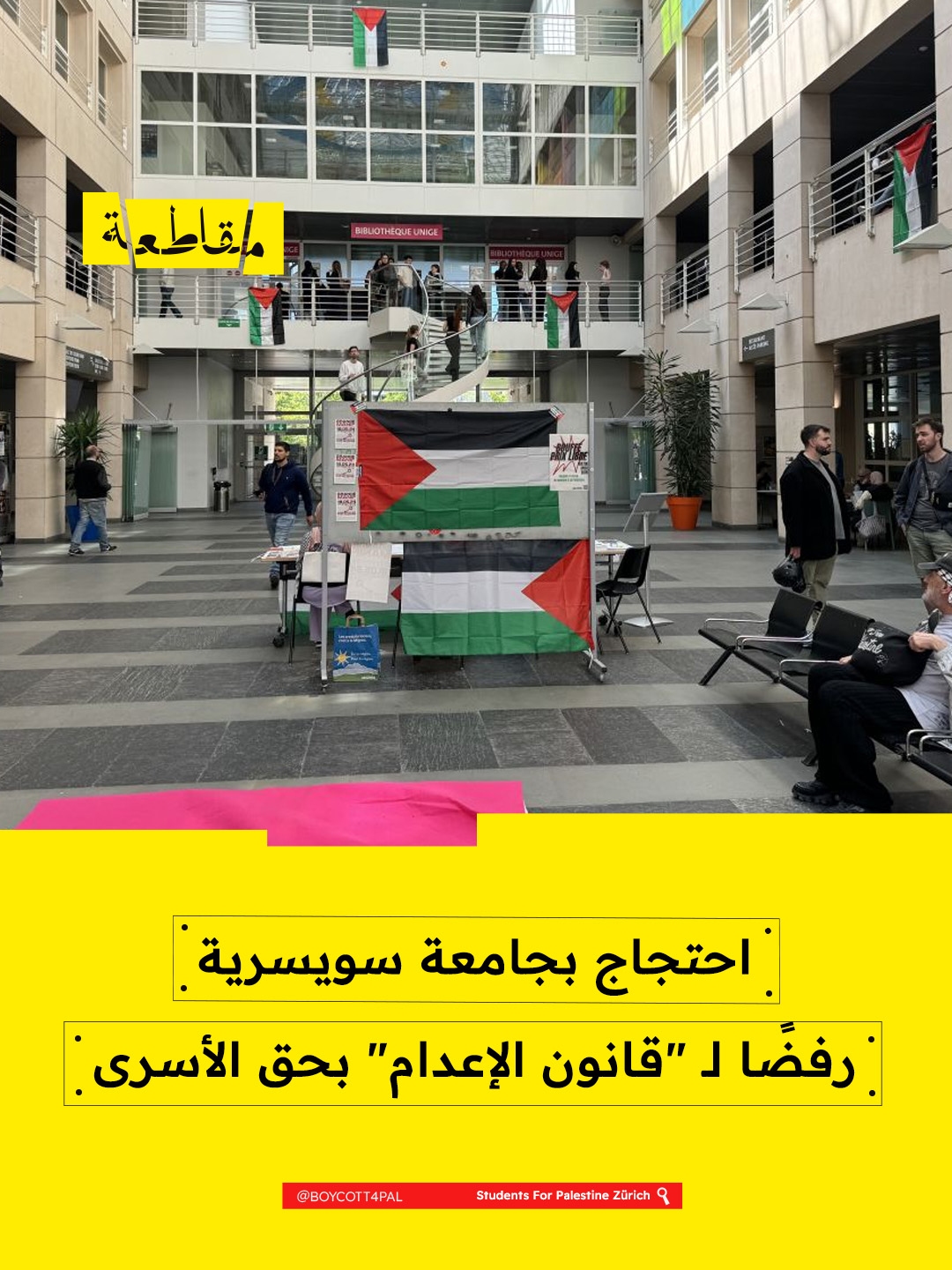 أطلق طلاب في جامعة زيورخ، في سويسرا، لافتات احتجاجية تنديدًا بمشروع قانون إعدام الأسرى الفلسطينيين، الذي صدق عليه الكنيست الإسرائيلي، وذلك تزامنًا مع إحياء يوم الأسير الفلسطيني في 17 أبريل 2026.