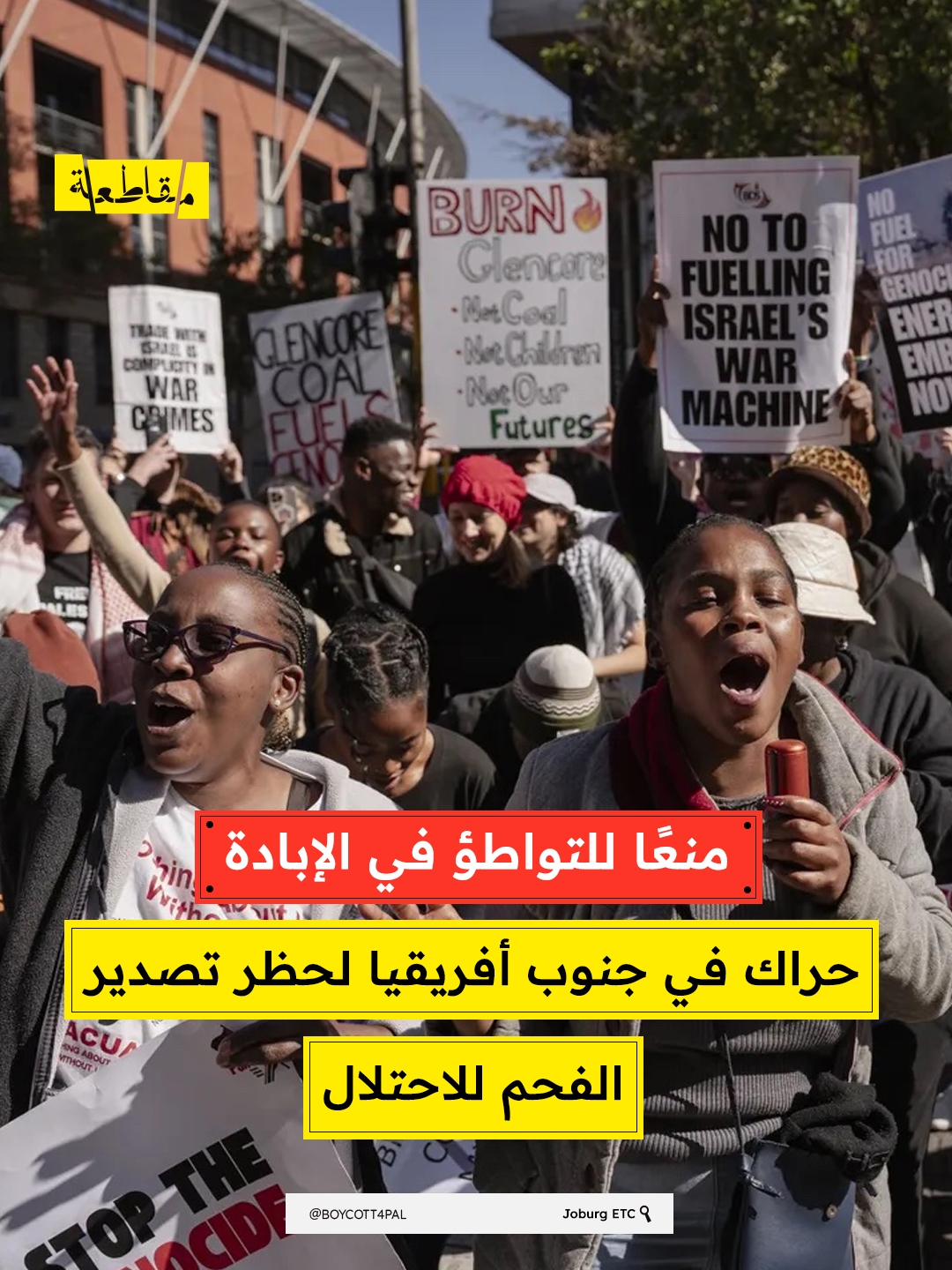 طالبت حركة المقاطعة وسحب الاستثمارات حكومة جنوب أفريقيا بالوقف الفوري لكافة شحنات الفحم المتجهة إلى الاحتلال، محذرةً من استخدامها في توليد الطاقة اللازمة لتشغيل المنظومات العسكرية الإسرائيلية التي تنفذ حرب الإبادة في قطاع غزة.