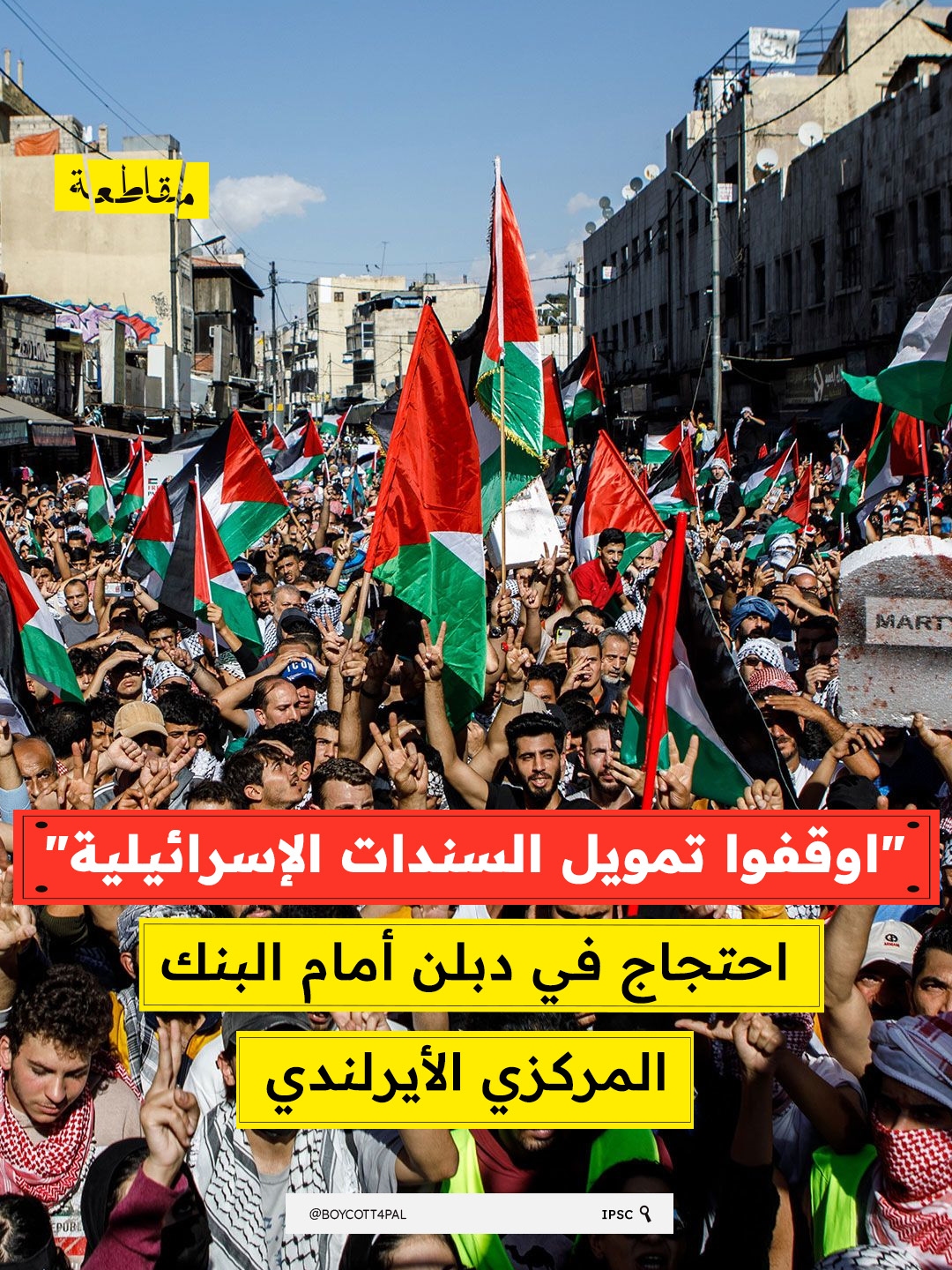 شهد محيط البنك المركزي الأيرلندي في دبلن وقفة احتجاجية نظمها ناشطون من منظمة حملة التضامن مع فلسطين في أيرلندا، طالبوا خلالها بوقف تمويل مؤسسات مالية دولية لسندات مرتبطة بالحكومة الإسرائيلية.