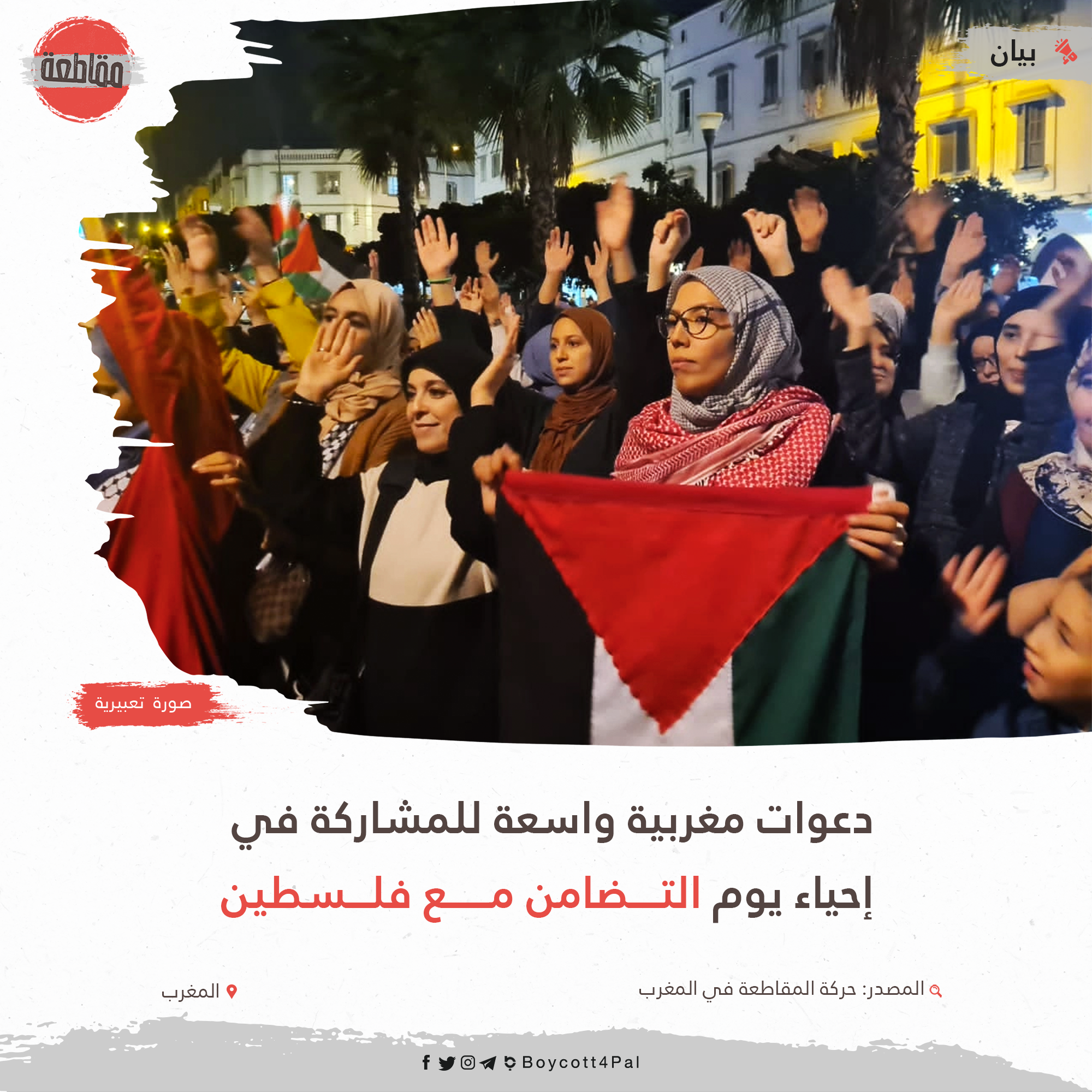 دعا كل من "حركة المقاطعة في المغرب والجبهة المغربية لدعم فلسطين، والمبادرة المغربية ضد التطبيع والعدوان، وتجمع مغاربة ضد التطبيع، والمرصد المغربي لمناهضة التطبيع"، للانضمام والمشاركة في إحياء فعاليات اليوم العالمي للتضامن مع الشعب الفلسطيني، الساعة الخامسة مساء اليوم الثلاثاء، أمام مقر البرلمان في الرباط.