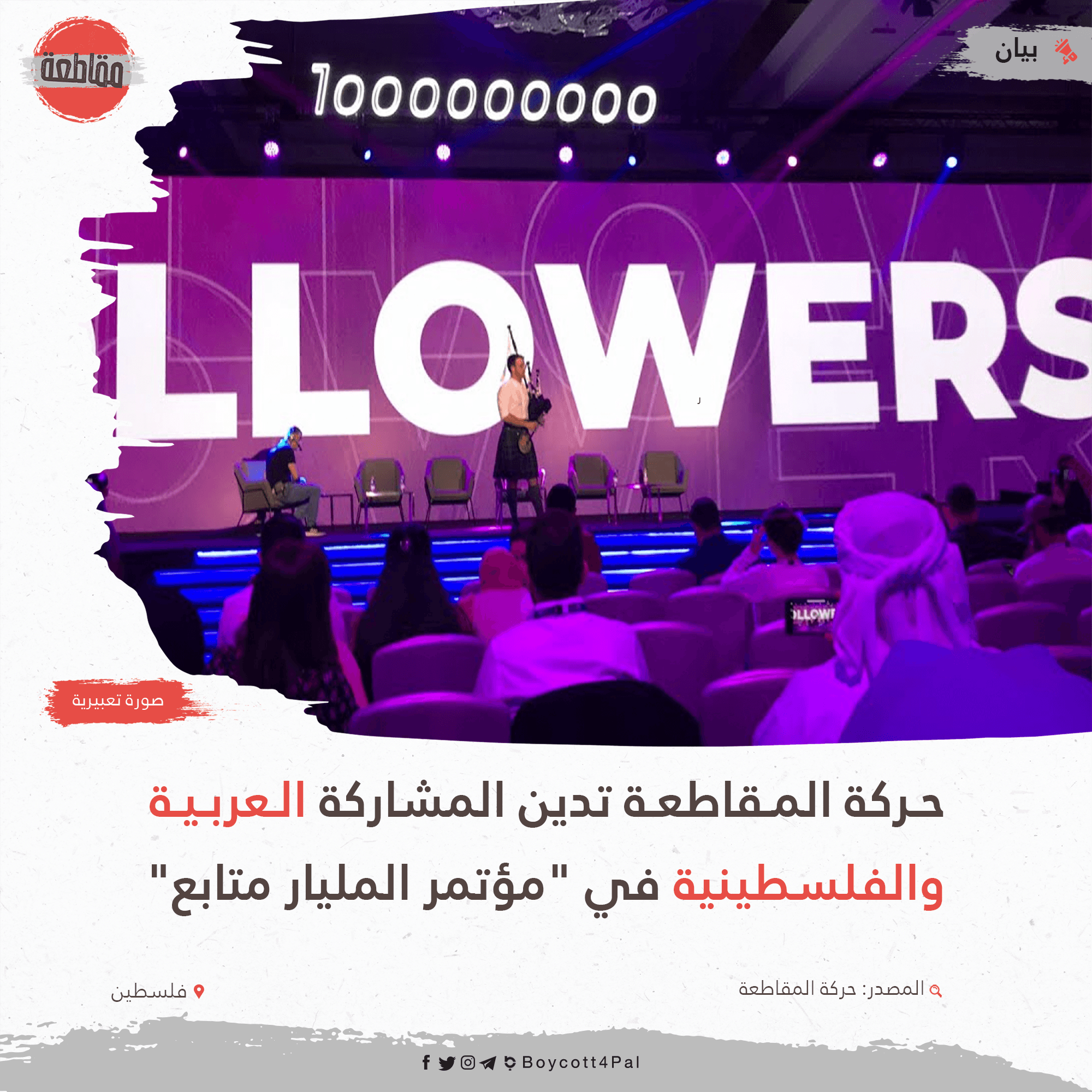 أدانت حركة المقاطعة مشاركة صانعي محتوى عرب، وبالذات فلسطينيين، في "مؤتمر المليار متابع" (One Billion Follower Summit) المدعوم من النظام الإماراتي وشركاته المتورطة في تنفيذ بنود اتفاقية التطبيع مع الاحتلال الإسرائيليّ، إلى جانب شركة "ناس" الممولة جزئيًا من شركات إسرائيلية.