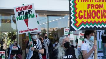 تنديدًا بتواطؤها في الإبادة.. أنصار فلسطين يُلاحقون مسؤولي “شيفرون” في تكساس